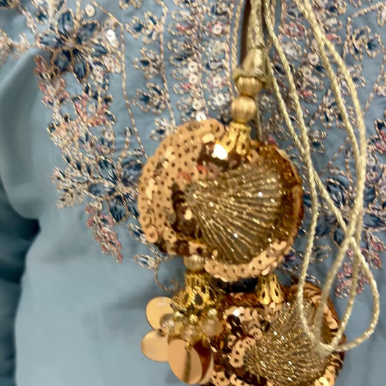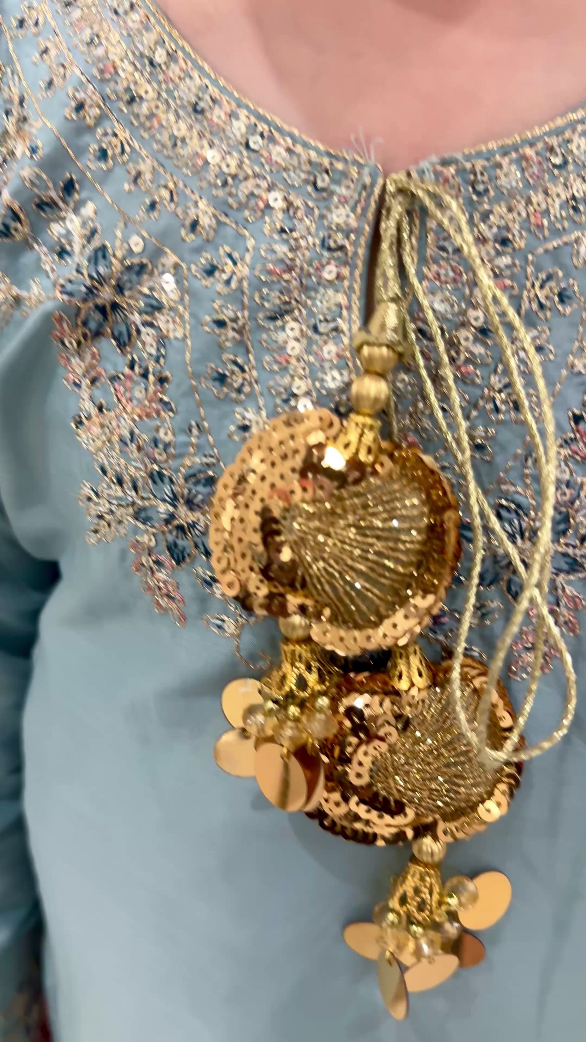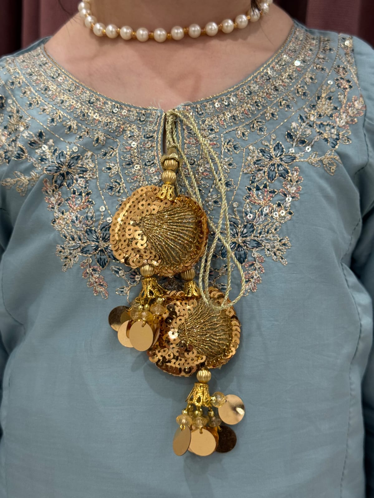 it is a soft sky blue-colored suit designed with delicate floral embroidery, perfect for casual days or special occasions. Made from lightweight cotton or lawn fabric, it ensures comfort and breathability all day long. The easy fit and elegant design make it a charming and stylish choice for young girls.