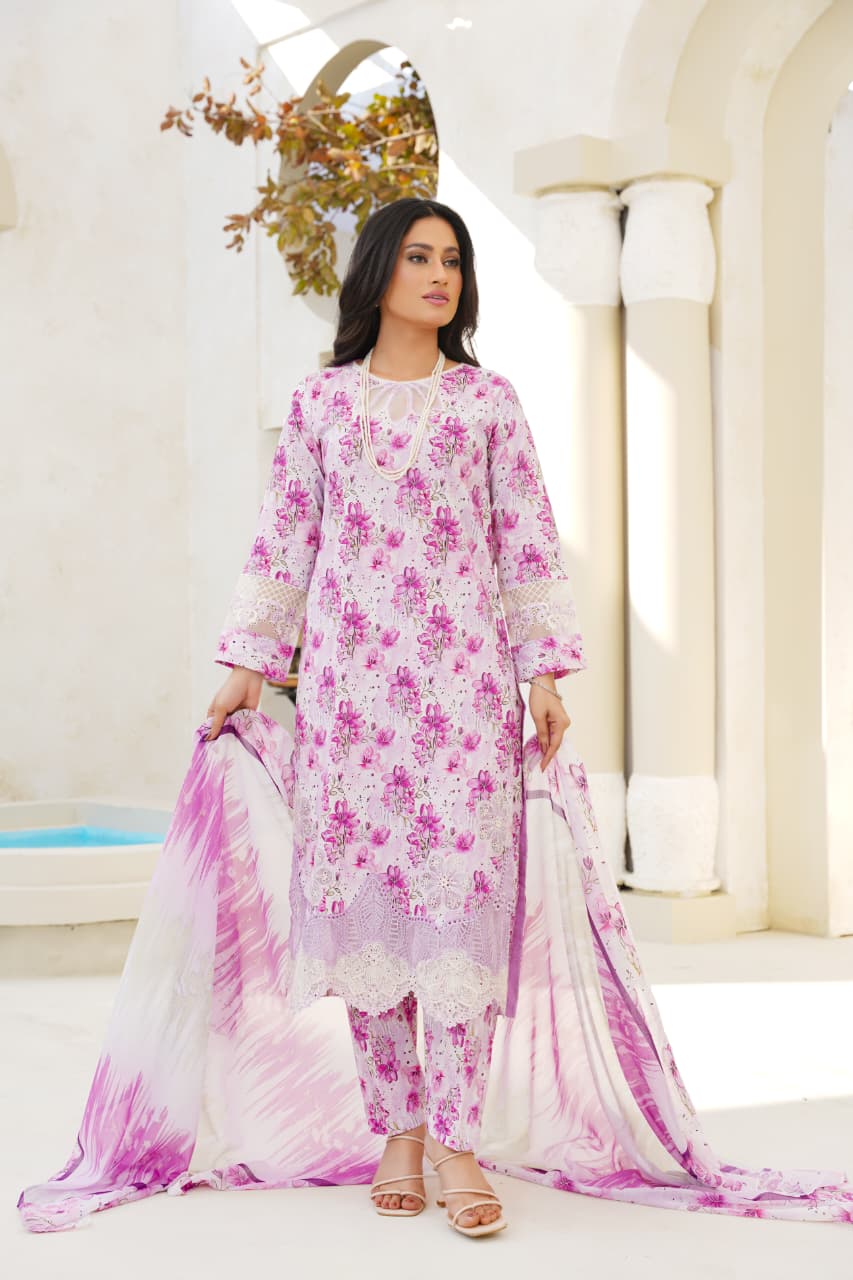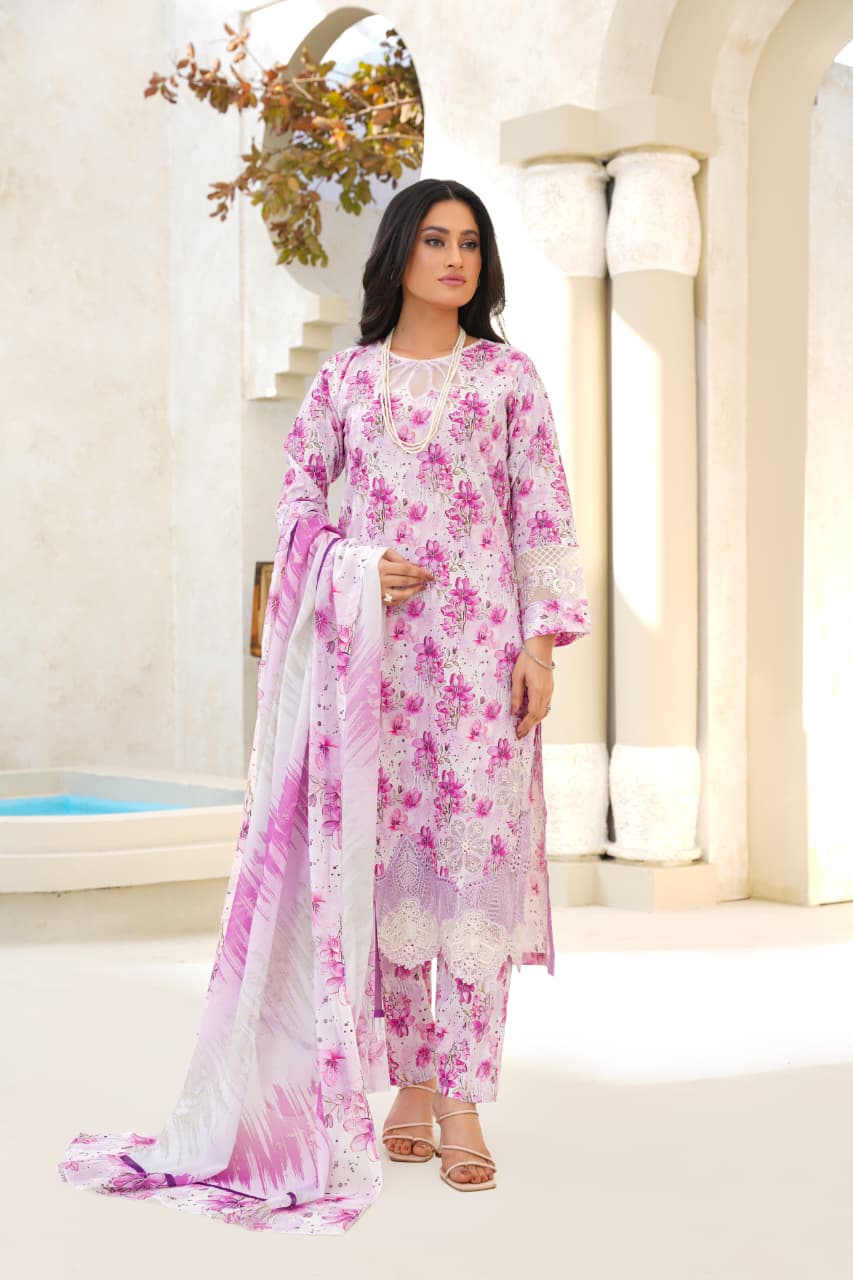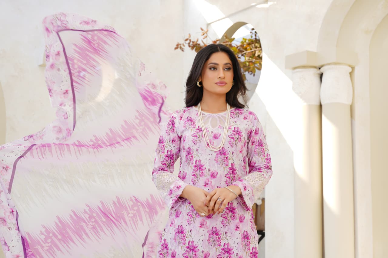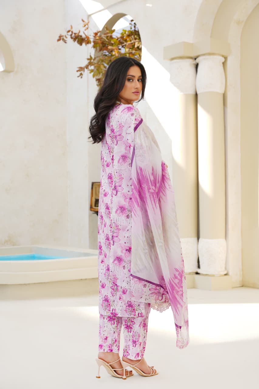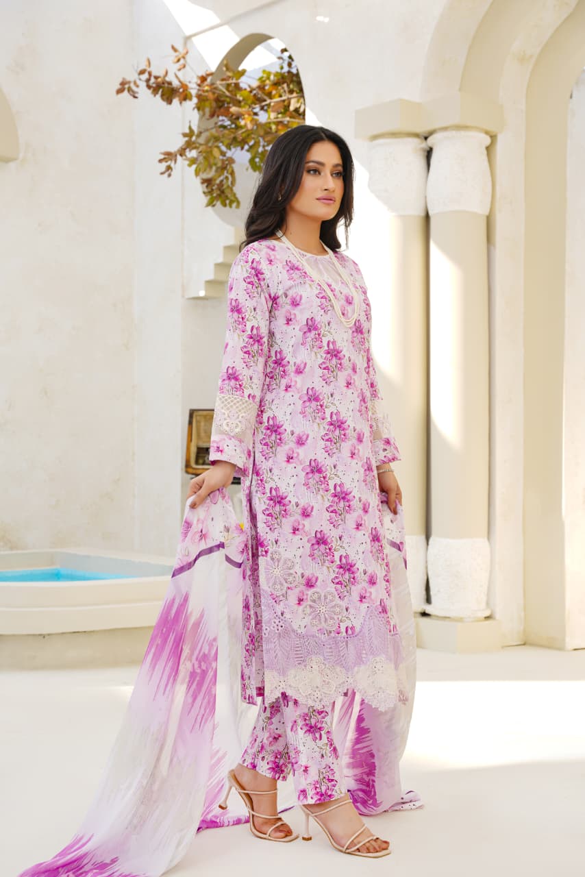 Embrace soft elegance with our Lilac Whisper Floral Lawn Suit, a graceful blend of delicate florals and soothing pastel hues. Crafted from premium-quality lawn fabric, this outfit features an all-over floral print with refined lace detailing on the hem and sleeves, adding a touch of feminine sophistication.