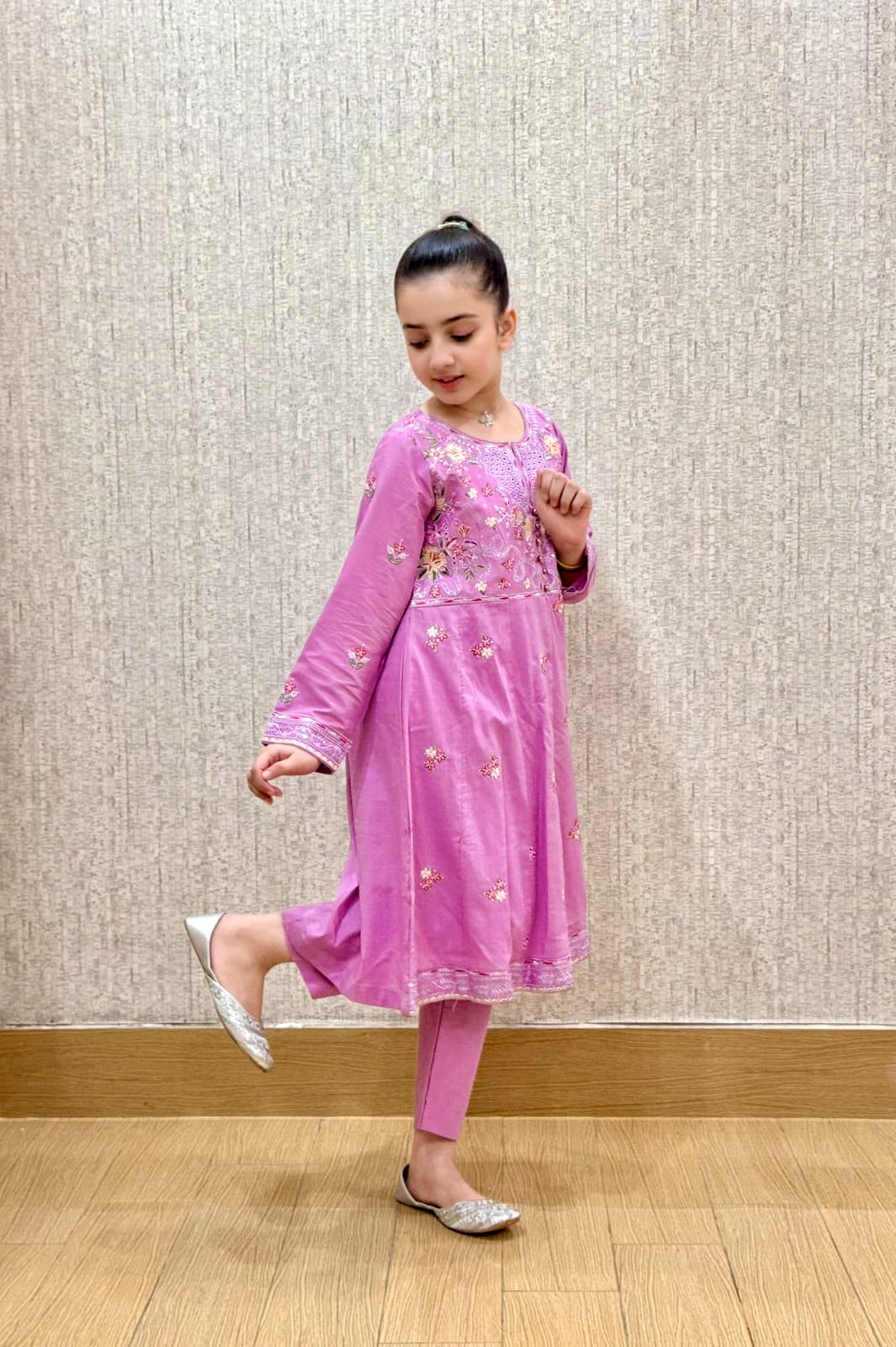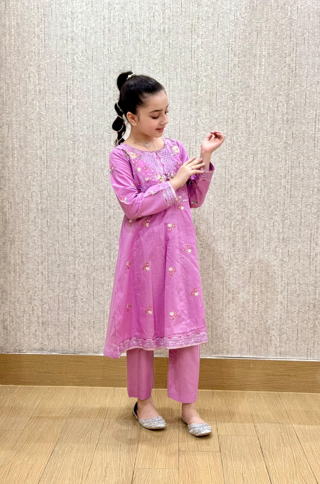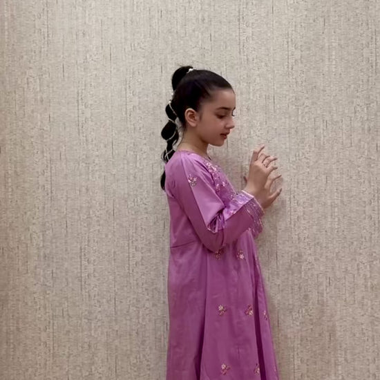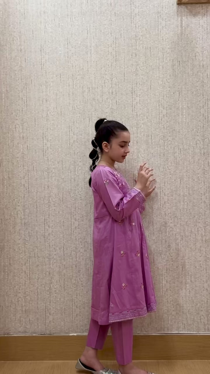 A soft lavender suit with cute pink floral embroidery. Made in light, comfy fabric — perfect for everyday wear or special occasions. Comes with a matching trouser.