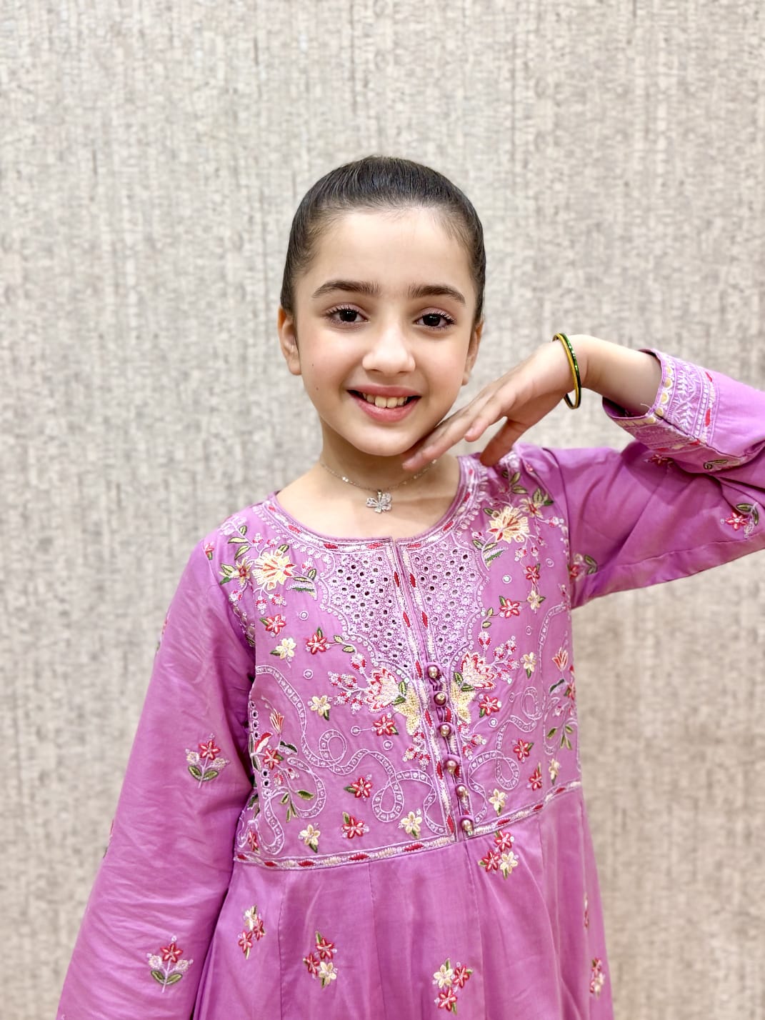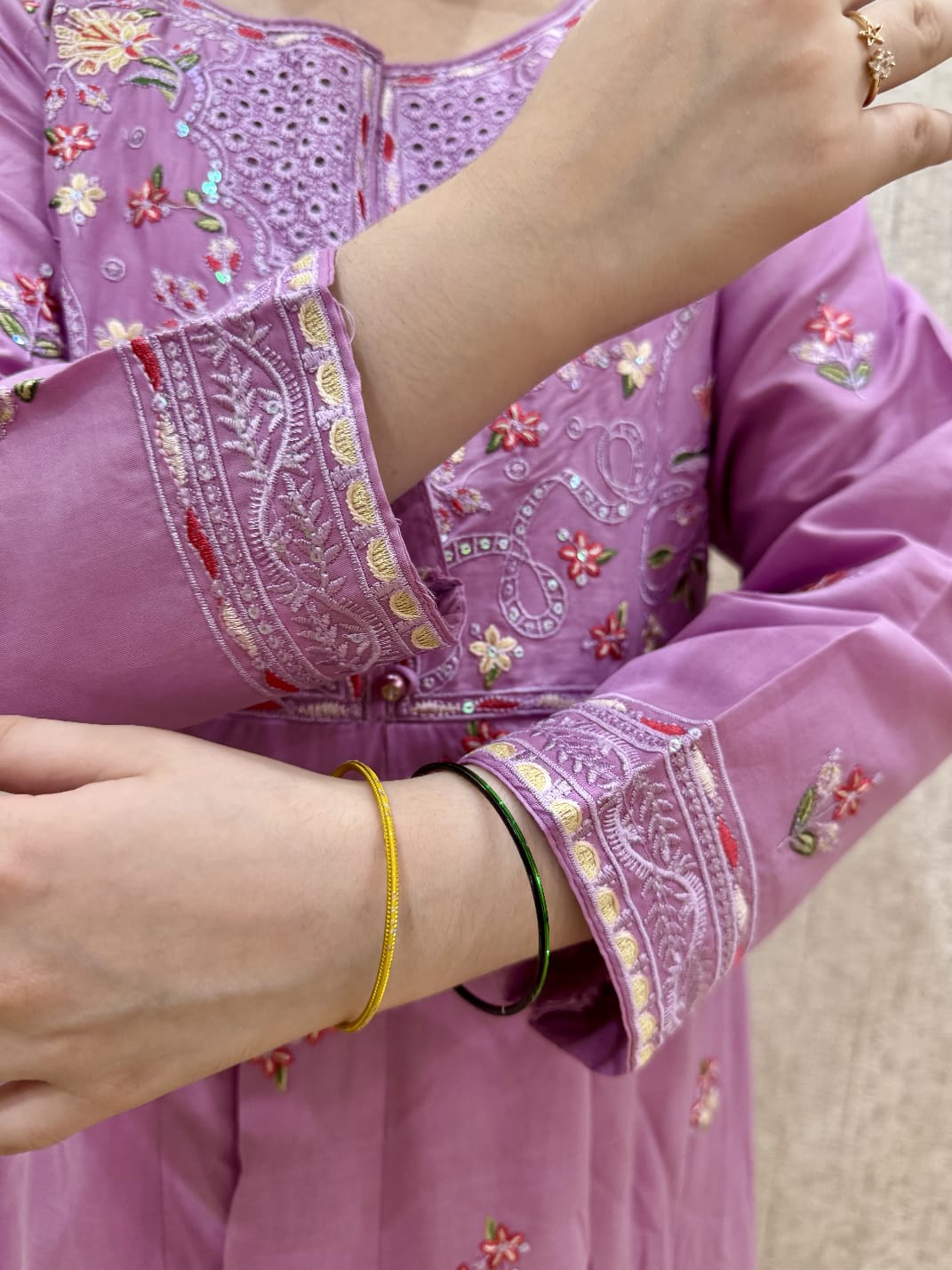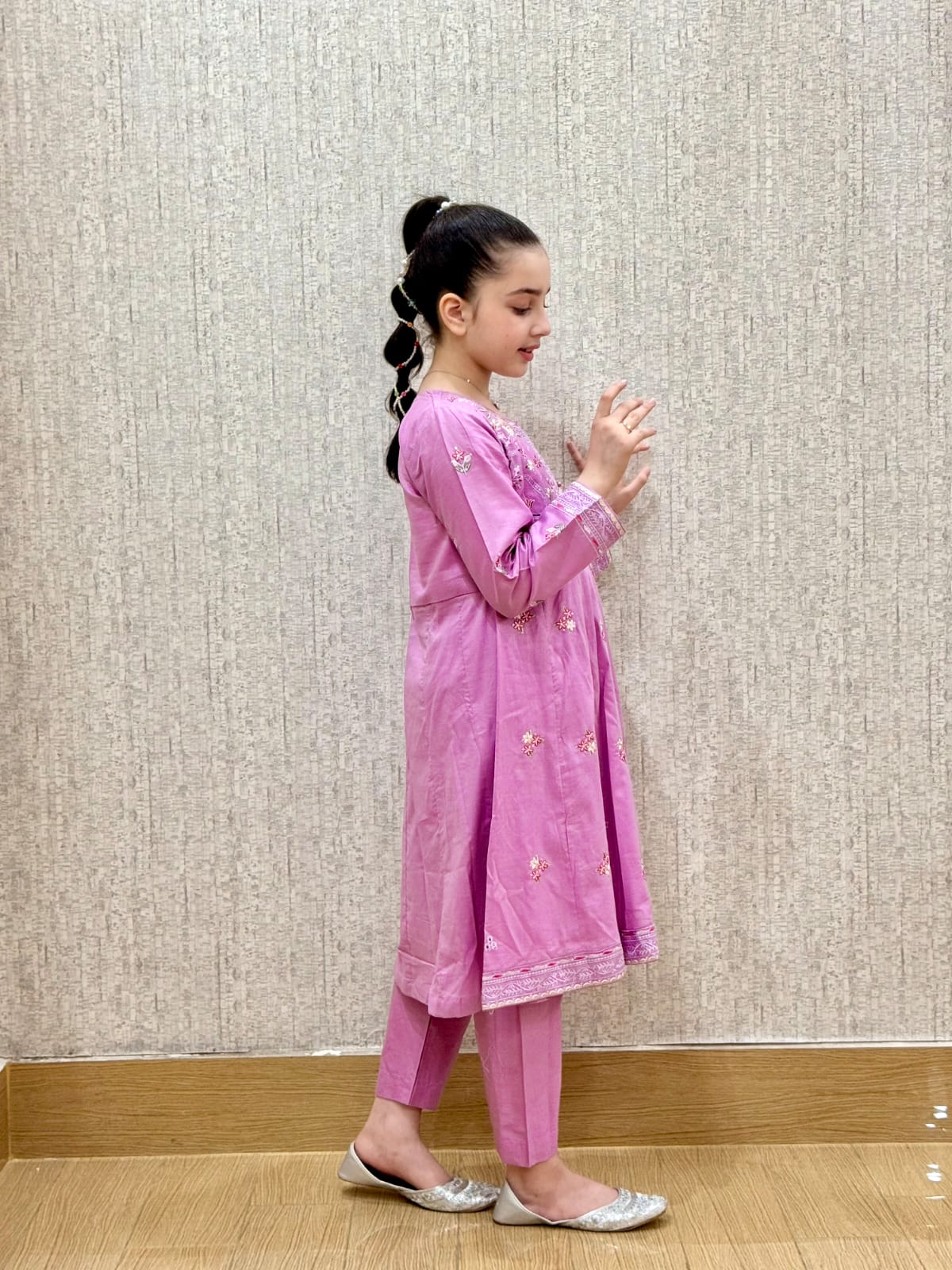 A soft lavender suit with cute pink floral embroidery. Made in light, comfy fabric — perfect for everyday wear or special occasions. Comes with a matching trouser.