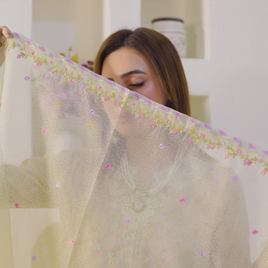 Radiate timeless sophistication in our Crystal 3-Piece Karandi Suit, a delicate fusion of tradition and elegance. Designed in a luxurious ivory base with soft pink and green floral embroidery, this outfit exudes understated grace—ideal for festive mornings, intimate gatherings, or sophisticated day events.