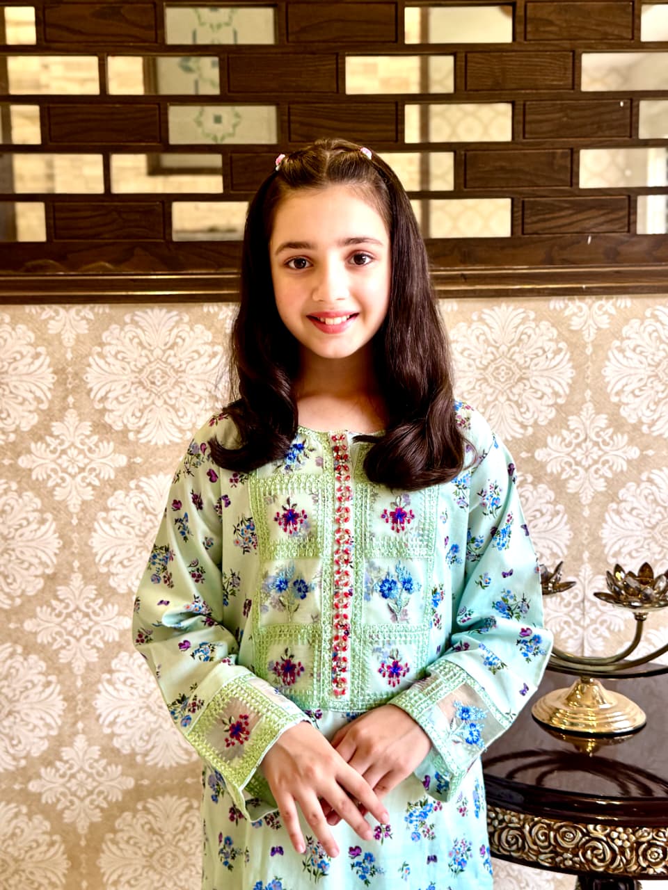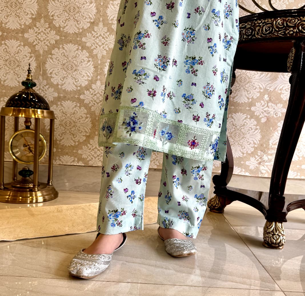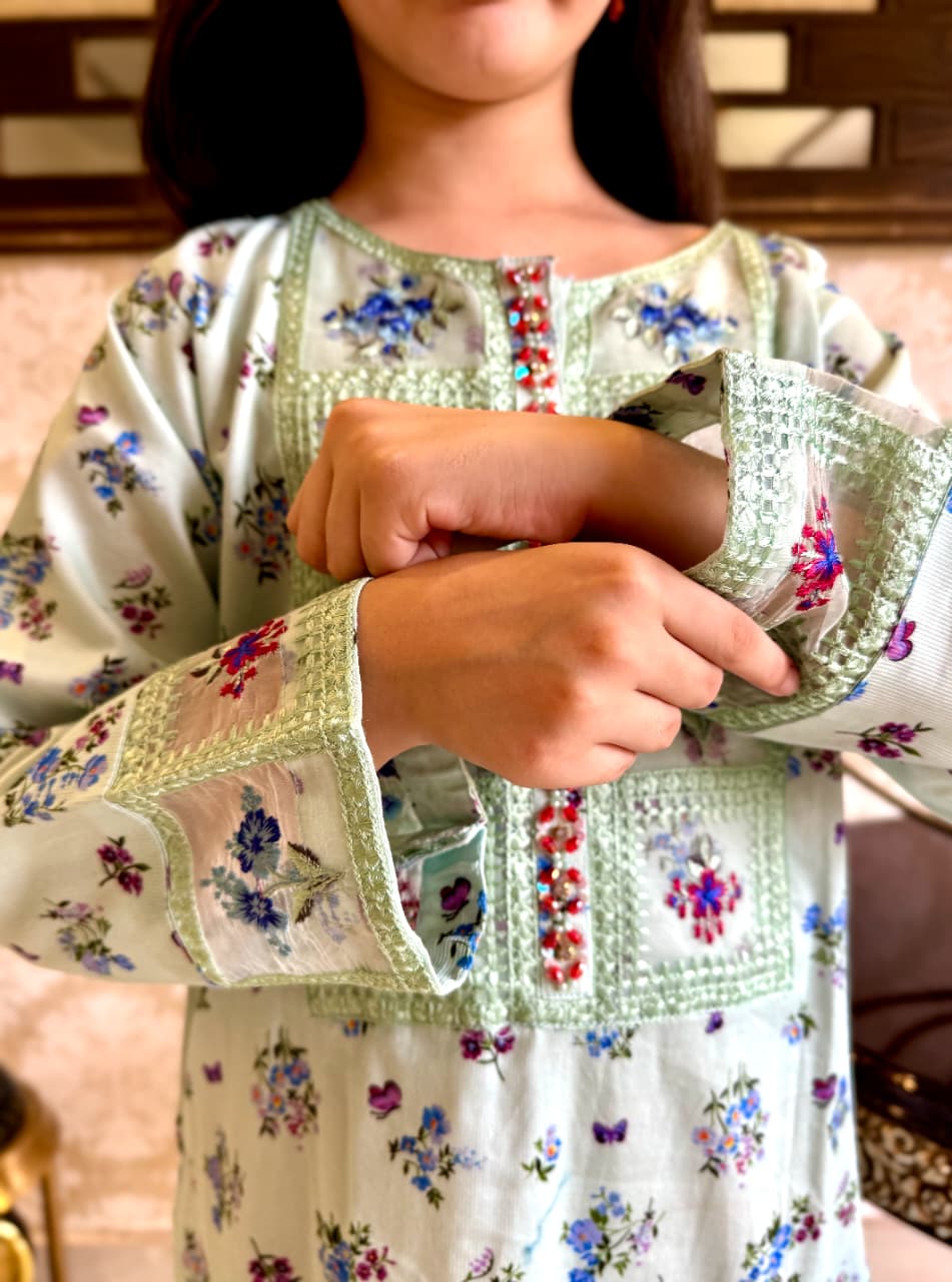 A refreshing mint green outfit beautifully adorned with dainty floral prints and delicate embroidery. The soft pastel tone paired with intricate detailing on the neckline and sleeves creates a graceful, charming look. Designed for both comfort and elegance, this outfit is perfect for casual gatherings, festive events, and everyday style with a touch of sophistication.