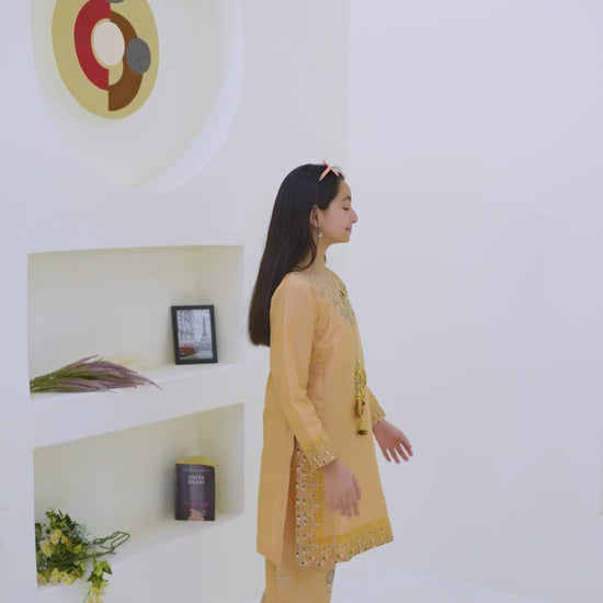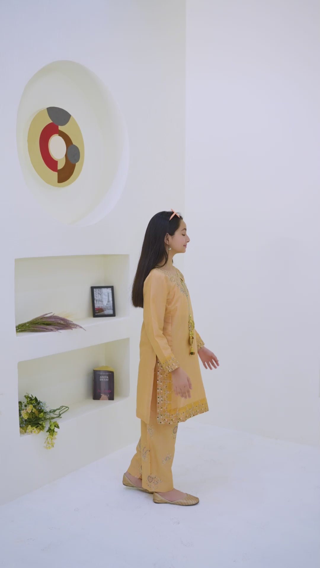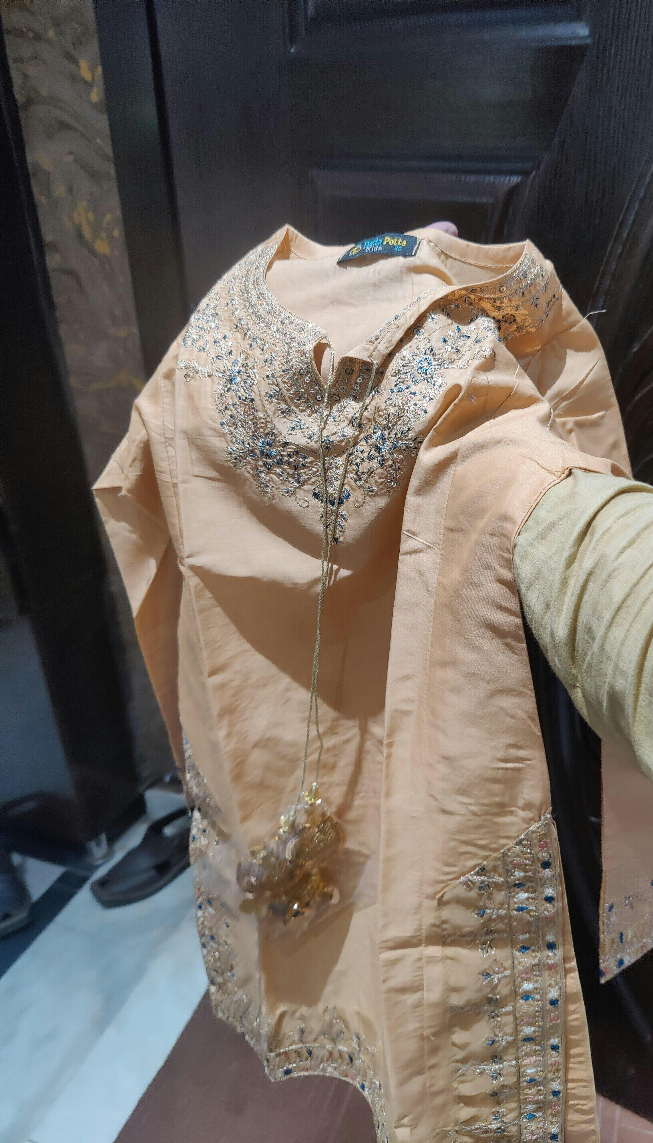 it is a soft peach-colored suit designed with delicate floral embroidery, perfect for casual days or special occasions. Made from lightweight cotton or lawn fabric, it ensures comfort and breathability all day long. The easy fit and elegant design make it a charming and stylish choice for young girls.