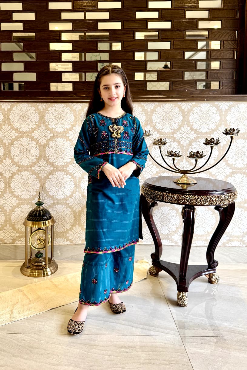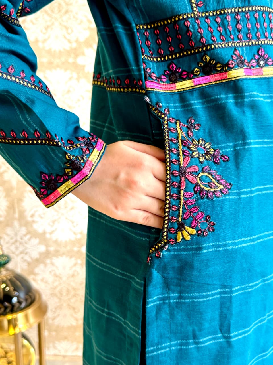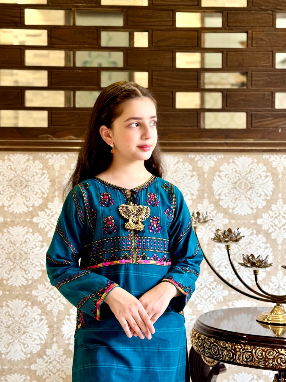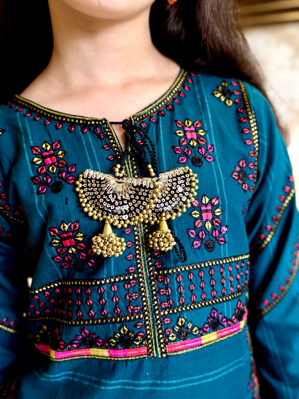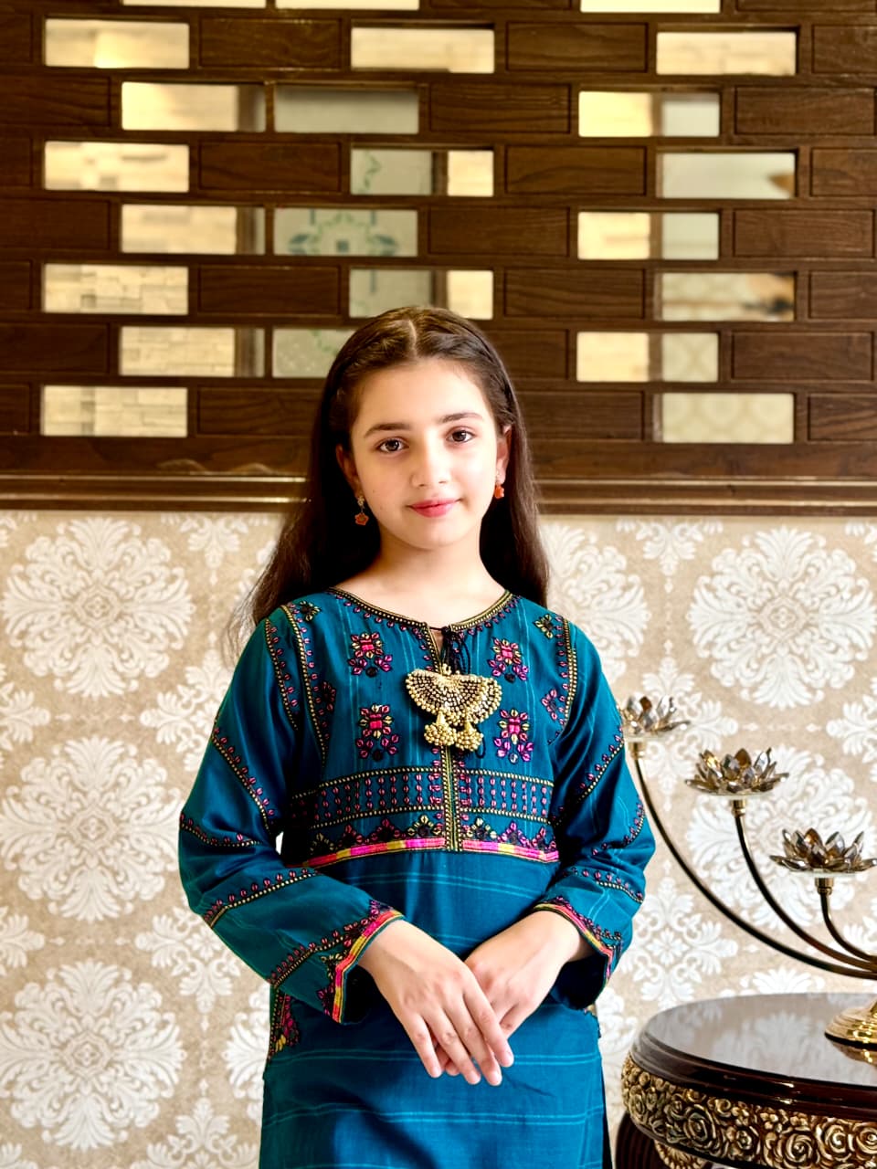 An enchanting sapphire blue dress adorned with vibrant embroidery and delicate detailing. The neckline features intricate patterns highlighted with a touch of traditional elegance, while the borders are finished with colorful accents for a festive flair. Paired with wide-leg trousers, this outfit brings together comfort and sophistication, making it perfect for family gatherings, festive occasions, and stylish everyday wear.