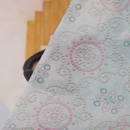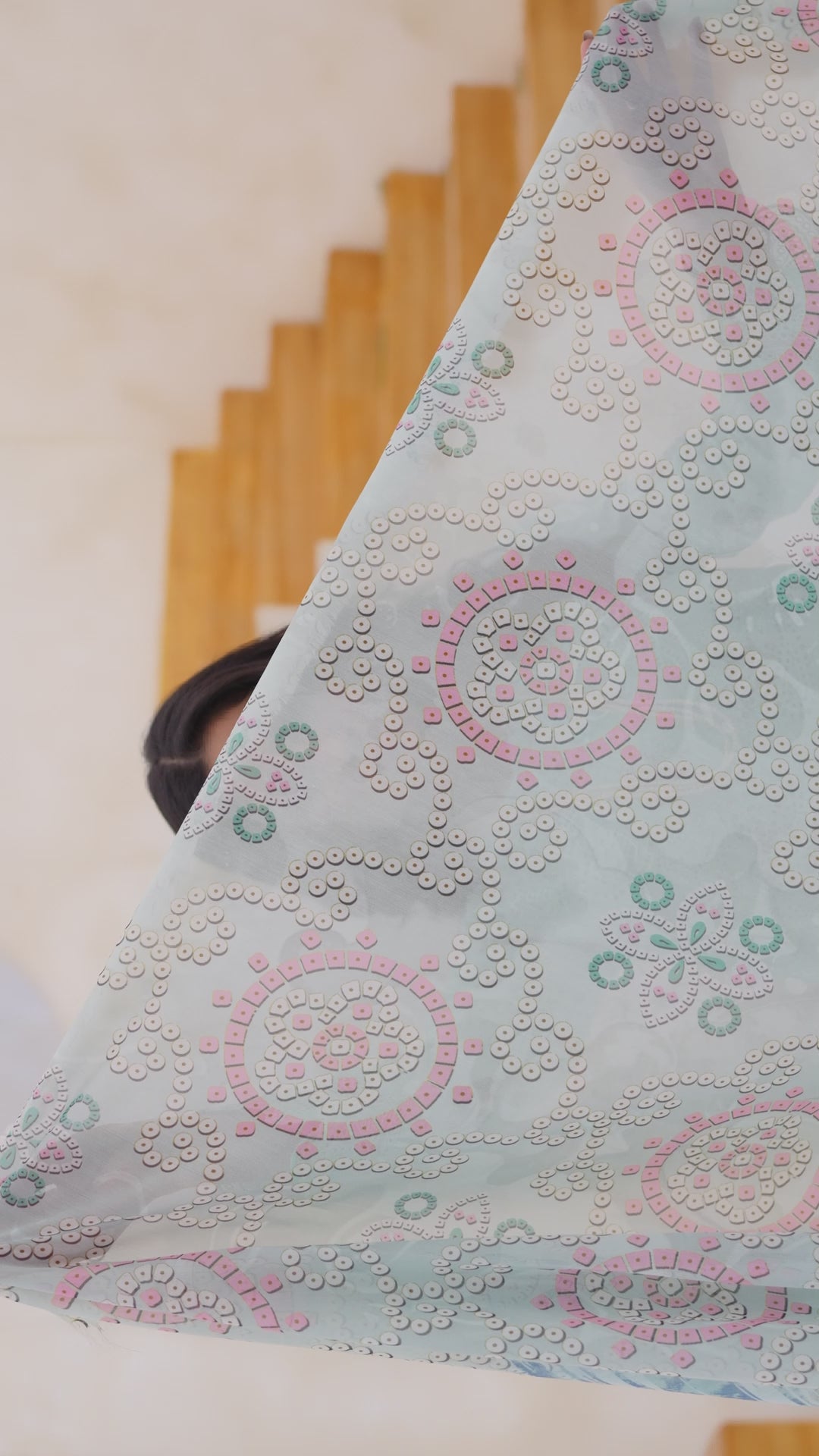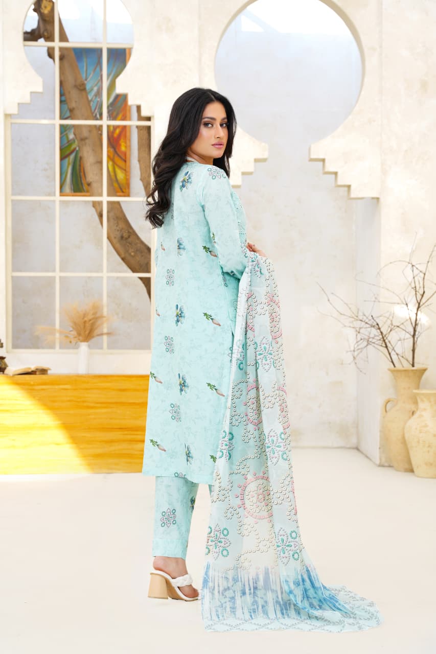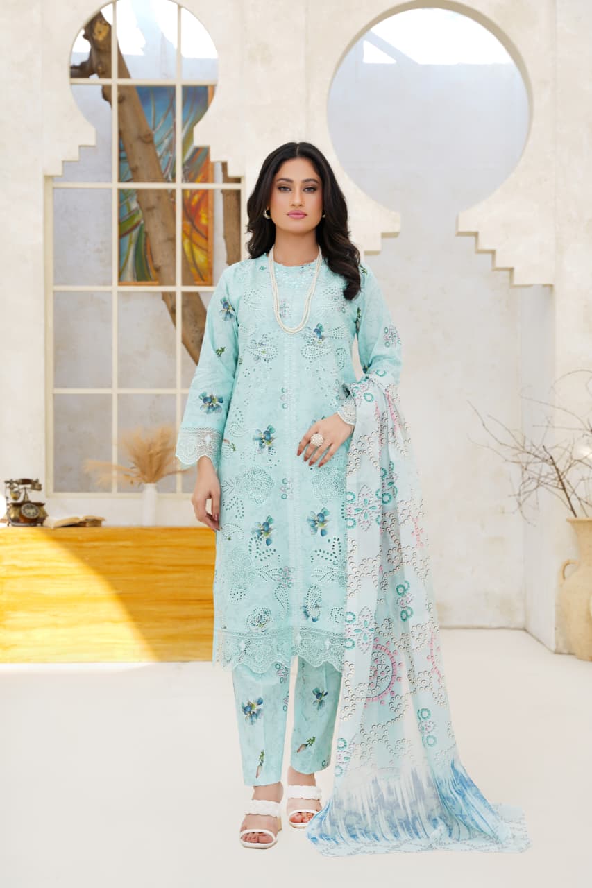 A refreshing blend of elegance and comfort, this 3-piece suit features a soothing aqua base enhanced with delicate floral embroidery and intricate cutwork detailing. The finely crafted shirt is paired with a matching printed trouser and a soft, flowing chiffon dupatta that adds a graceful finish. Light, breathable, and effortlessly stylish, this ensemble is perfect for summer days, festive brunches, and refined everyday wear.